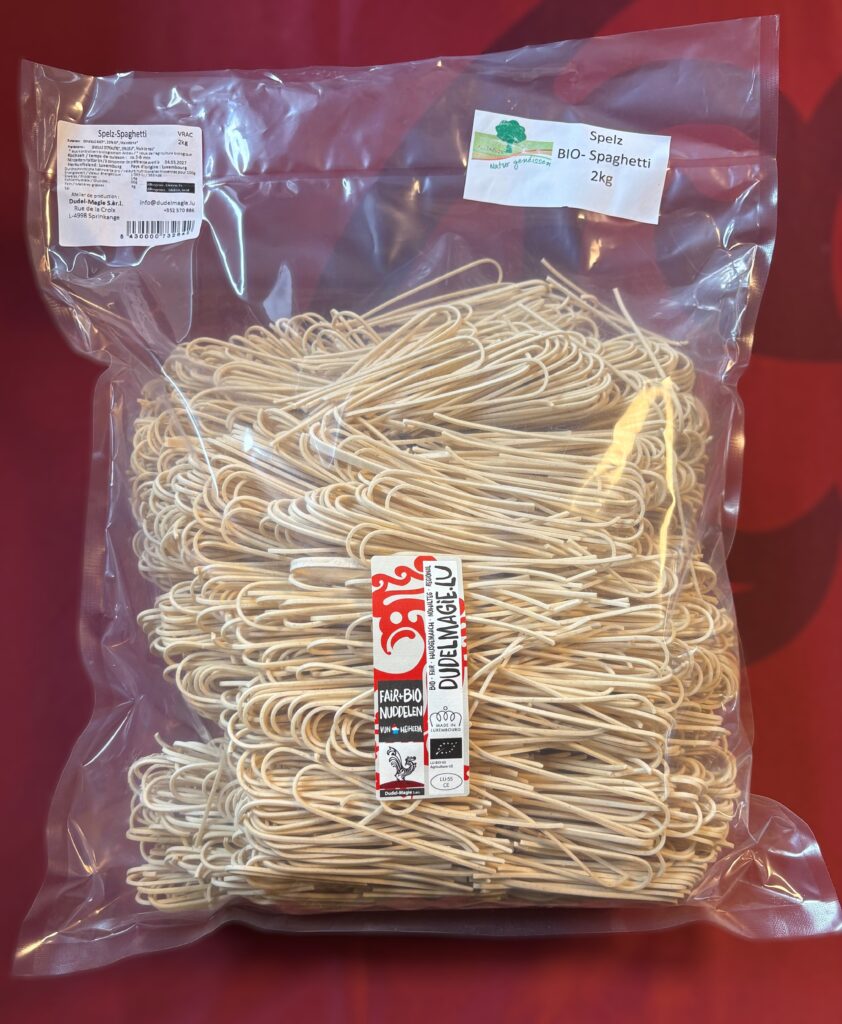 BeschreiwungKonditiounPräis/SachetBio rout Spaghetti (Tomat)Sachet 500g Konditioun5,90 € Präis/SachetBio Lasagneblieder (+/- 14 x 12 cm)Sachet 500g Konditioun5,70 € Präis/SachetVegan Spelz Nuddelen
